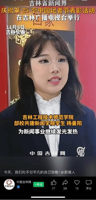 学院师生代表20余人受邀参加吉林省新闻界庆祝第 25 个中国记者节表彰活动,我院编辑出版学2343班杨曼阳同学现场接受中国吉林网采访。