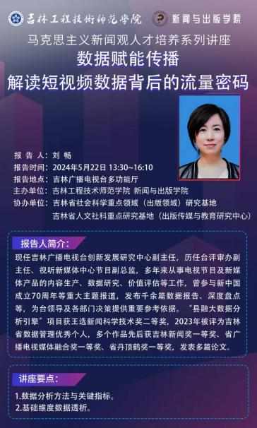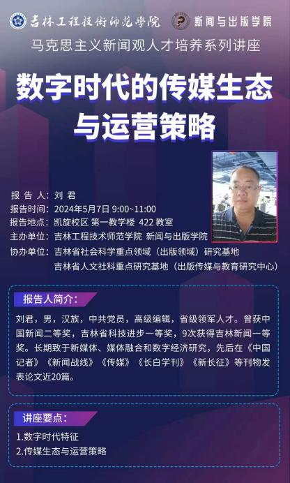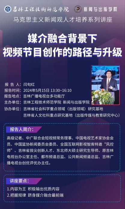 学院依托“部校共建”优势平台,邀请吉林广播电视台和吉林日报社的一线工作者走进课堂,开展马克思主义新闻观人才培养系列讲座4场,部校共建新闻大讲堂系列讲座9场。