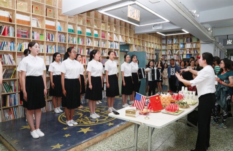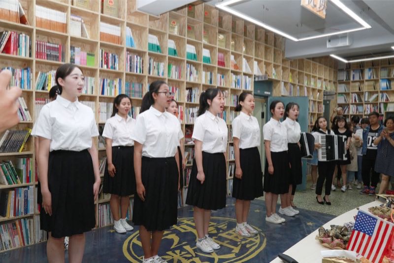 最后传媒学院在文化走廊举行了小型演唱会。美国客人一边品尝我国地方特色的传统美食,一边欣赏学生们演唱的女声小合唱《茉莉花》,在欢乐的乐曲声中,来访的美国客人也纷纷上台表演,最后与传媒学院的学生一起载歌载舞,在热烈而奔放的乐曲声中结束了整个活动。