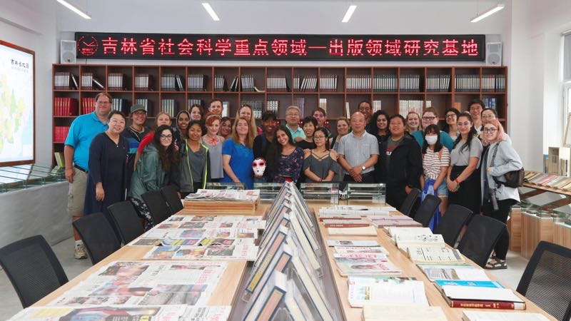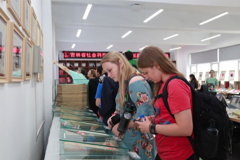 文化交流活动结束后,陈少志院长带领来访的美国客人参观了传媒学院数字影像工作室、印刷出版实验室、出版领域文献展列室。在传媒学院品牌工作室——数字影像工作室,客人们观看了工作室学生自己录制的微视频。在传统印刷实训室,不仅向客人展示了印刷设备及技术,同时让来访的美国客人亲自操作凸版手动印刷机,了解传统印刷的流程。参观活动结束后,客人们纷纷在文献展列室的留言簿上留言,表达了对传媒学院的赞美与感激之情。