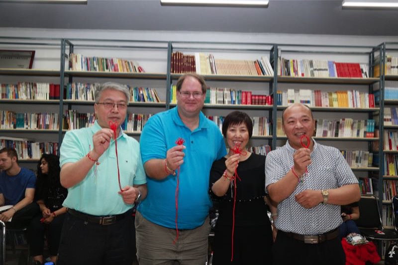 传媒学院为此次文化交流活动做了精心的准备。苏琳博士全程用英语介绍了中国的传统文化,同时,指导来访的美国客人亲自编织中国结。王义录书记亲自上阵,头戴京剧脸谱,拉京胡、唱京剧,把文化交流活动推向了高潮。