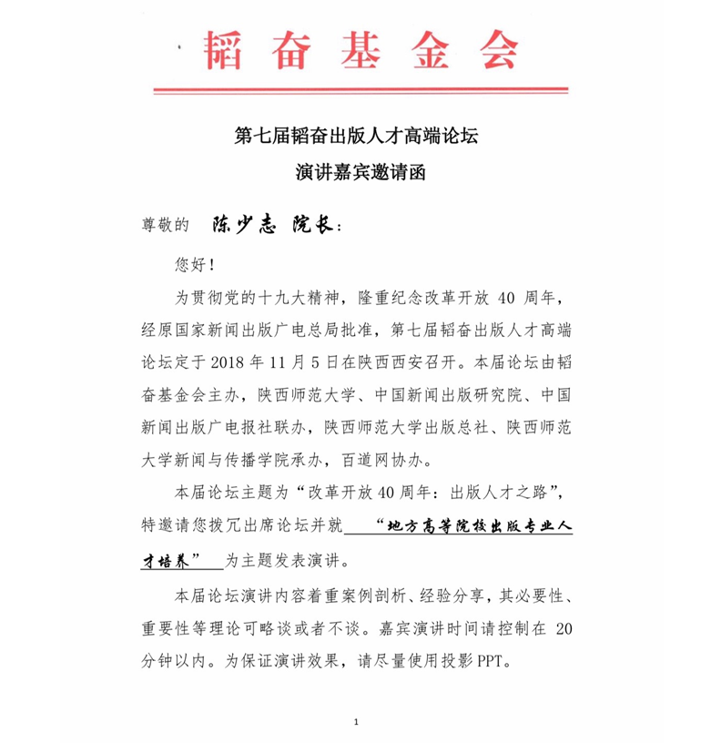 本届论坛主题为“改革开放40周年,出版人才之路”,我校传媒学院院长陈少志教授应邀出席本次论坛并就“地方高等院校编辑出版学专业股份制办学的探索与实践”为主题发表演讲。