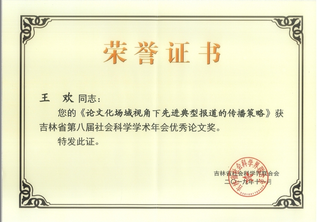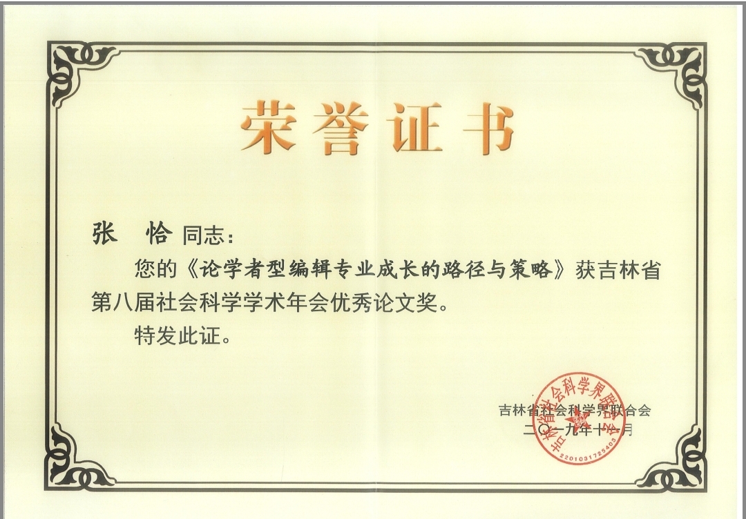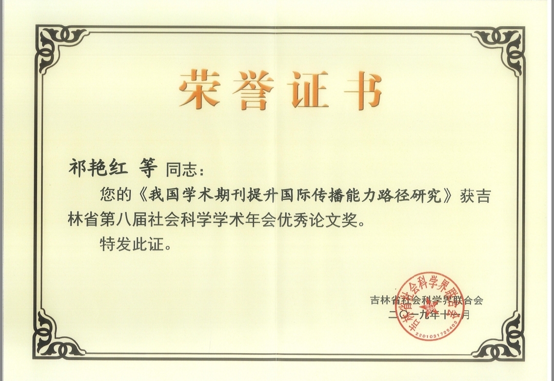 会议宣读了第八届社会科学学术年会优秀组织奖和优秀论文奖的表彰决定,吉林省编辑出版学会荣获本届学术年会优秀组织奖。此外,学会推荐参评的学术论文获得三项优秀论文奖。获奖论文分别是我校传媒学院祁艳红等教师的论文《我国学术期刊提升国际传播能力路径研究》,王欢的论文《论文化场域视角下先进典型报道的传播策略》,东北师范大学出版社张恰的论文《论学者型编辑专业成长的路径与策略》。
